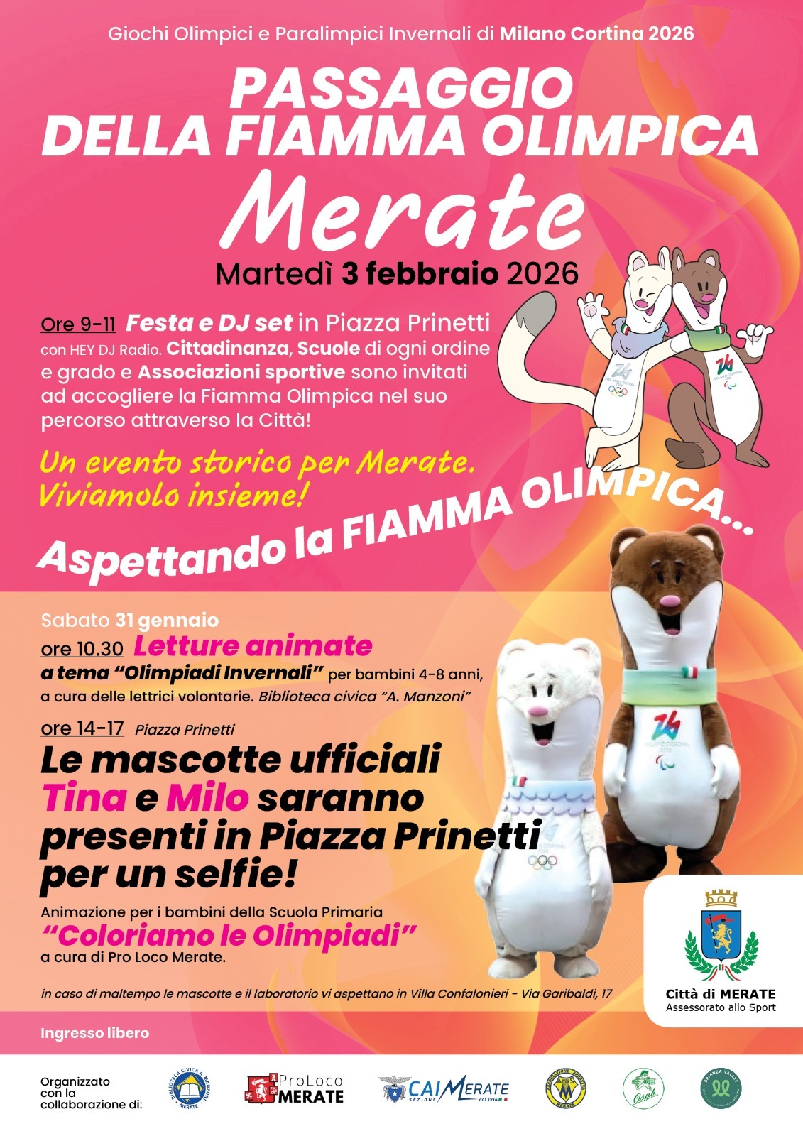Nel pomeriggio (ore 14-17) Piazza Prinetti accoglierà Tina e Milo, i due simpatici ermellini mascotte ufficiali dei Giochi: Tina, dal manto chiaro, rappresenta i Giochi Olimpici Invernali; Milo, suo fratello minore con il pelo più scuro, è il volto dei Giochi Paralimpici. Saranno a disposizione per foto, abbracci e selfie indimenticabili.