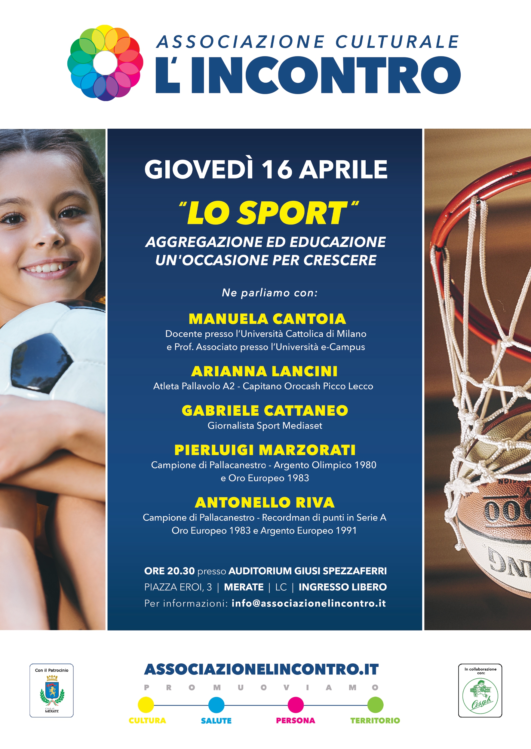 L’Associazione Culturale “L’Incontro” di Merate presenta il convegno “Lo Sport. Aggregazione ed educazione, un’occasione per crescere” che si terrà presso l’Auditorium comunale G. Spezzaferri il 16 aprile 2026 alle ore 20:30.