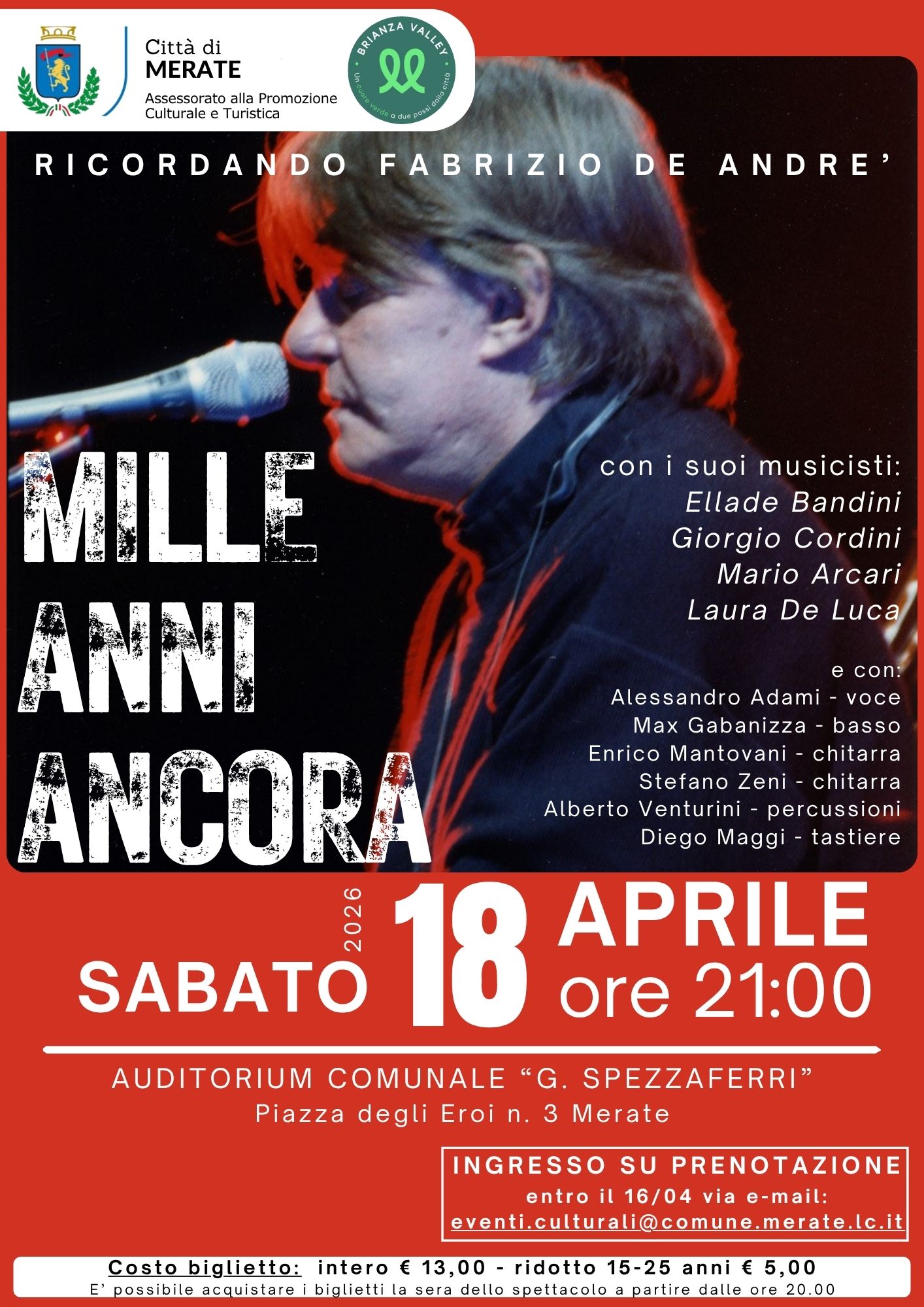 SABATO 18 APRILE 2026 ORE 21.00 presso l’Auditorium Comunale “G. Spezzaferri” si terrà il concerto “MILLE ANNI ANCORA – RICORDANDO FABRIZIO DE ANDRE‘”.