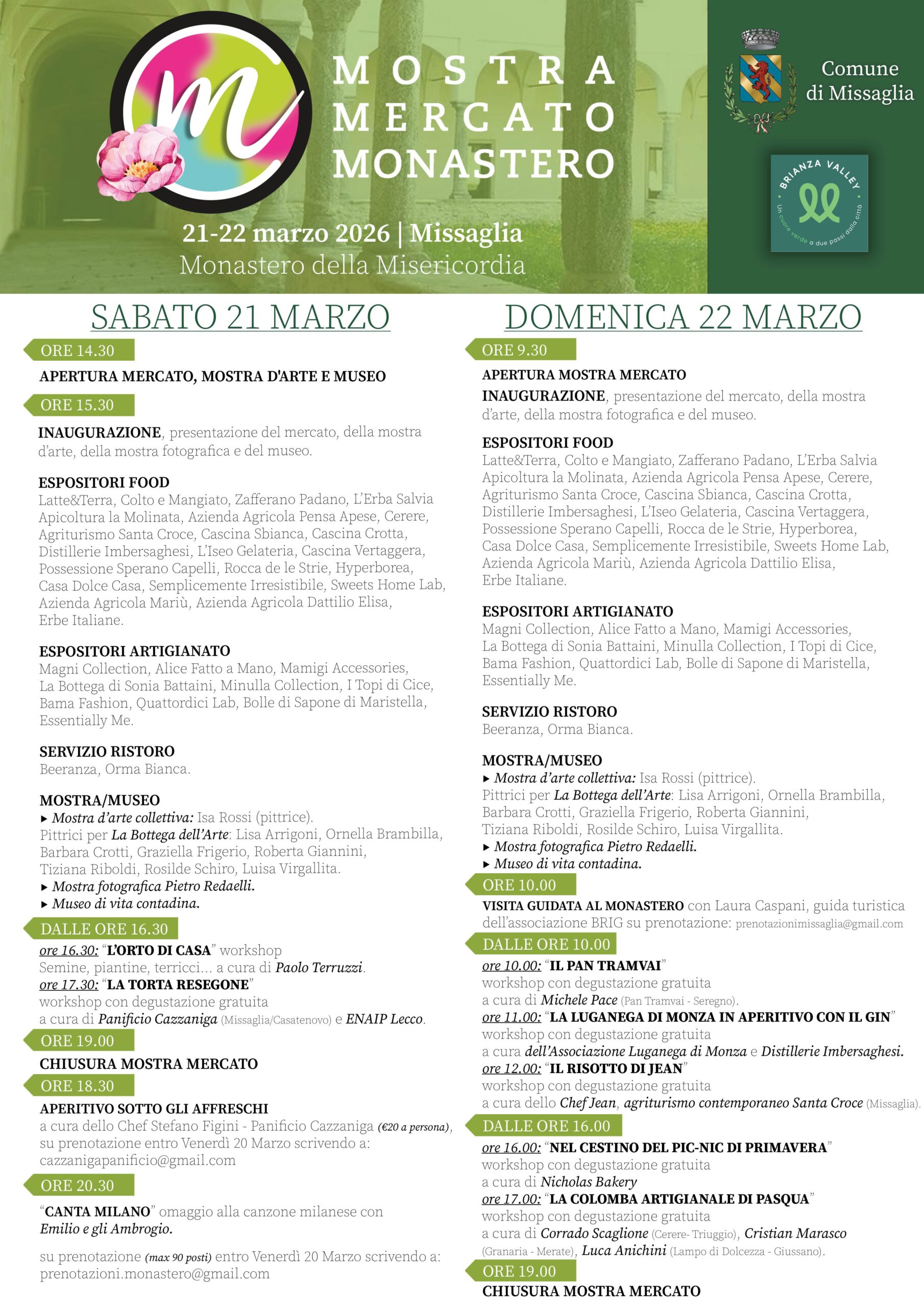 Programma: espositori food – artigianato – mostra d’arte – museo – workshop gratuiti – aperitivo sotto gli affreschi – intrattenimento musicale – visita guidata