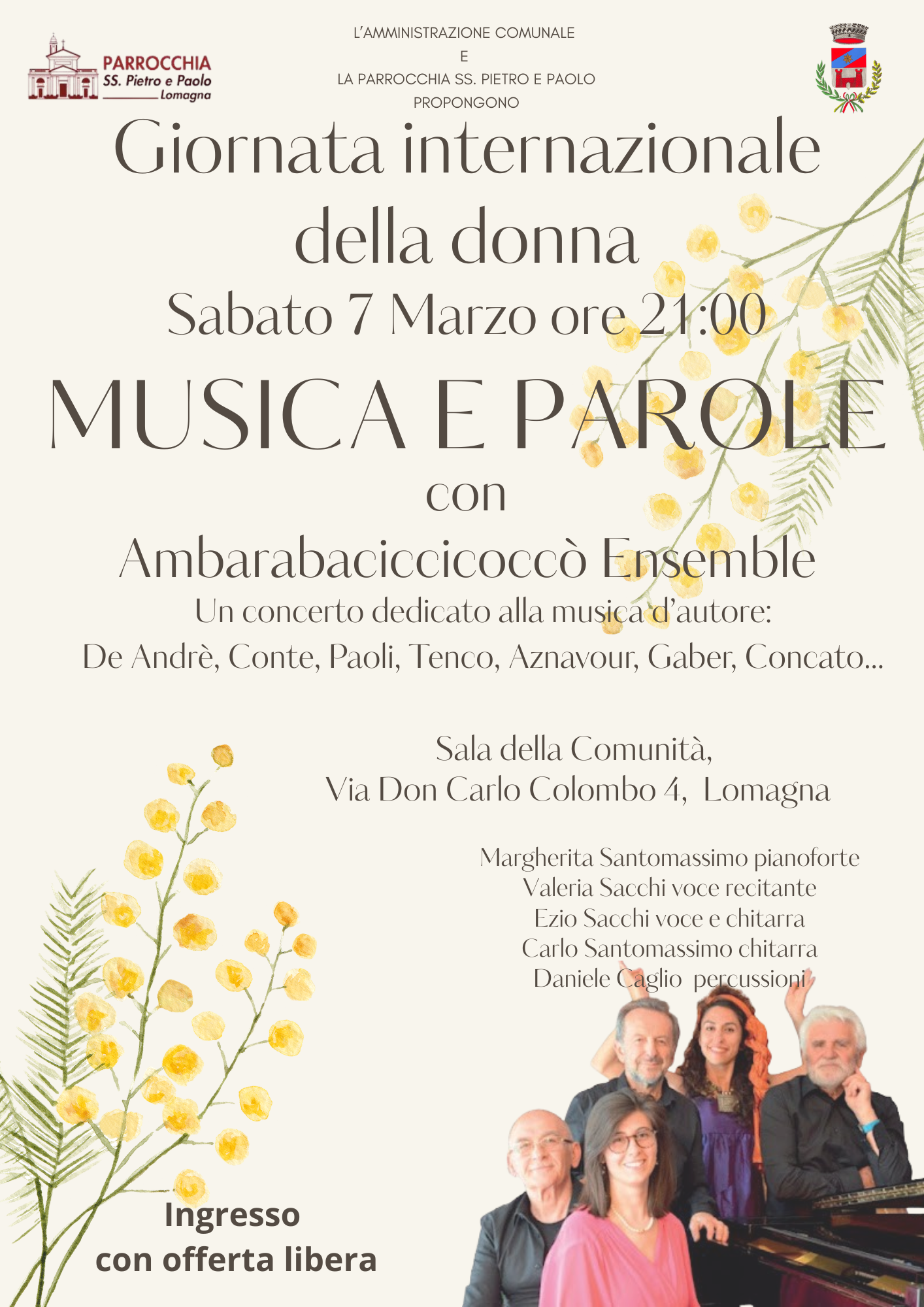L’Amministrazione Comunale e la Parrocchia SS. Pietro e Paolo, in occasione della Giornata Internazione della Donna, propongono un concerto dedicato alla musica d’autore:De Andrè, Conte, Paoli, Tenco, Aznavour, Gaber, Concato…con Ambarabaciccicoccò Ensemble.