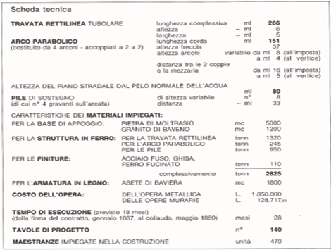 Il ponte è lungo 266 metri e si trova ad un’altezza di 85 metri rispetto alla quota del fiume. La struttura è ad arco, realizzata interamente con travi inchiodate con due i livelli di percorribilità, sopra le auto, sotto i treni. Le tecnologie utilizzate erano simili a quelle della Tour Eiffel : il progettista utilizzò per i calcoli di stabilità della struttura la teoria dell’ellisse di elasticità impostata da Carl Culmann e basata sulla proporzionalità tra sforzi e deformazioni. Il ponte è stato oggetto di un importante restauro che lo ha riportato allo splendore originario. Tuttavia l’età si fa sentire e si prevede la dismissione commerciale (transito Treni ed auto) entro il 2030, limitando l’utilizzabilità a pedoni e biciclette.